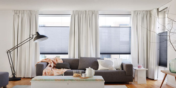 Når der ikke er behov for afskærmning, kan gardinerne trækkes helt op og fylder kun lidt øverst i vinduet, så du får frit udsyn. De karakteristiske, skarpe vandrette folder skaber et blødt og stilfuldt udtryk i rummet.
